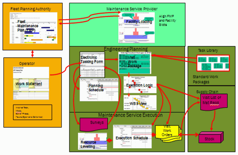 Detail Planning - Even before an asset is induced into a service provider’s facility for the agreed maintenance visit a degree of planning occurs. This comprises of the determination of the major task of the visit, decisions on how to arrange, group and sequence the visit, how to load the facilities and resources, how to balance the workload within the maintenance facility as well as across shared services, i.e. paint shops and other back shops. Some of the actions performed as part of this includes: