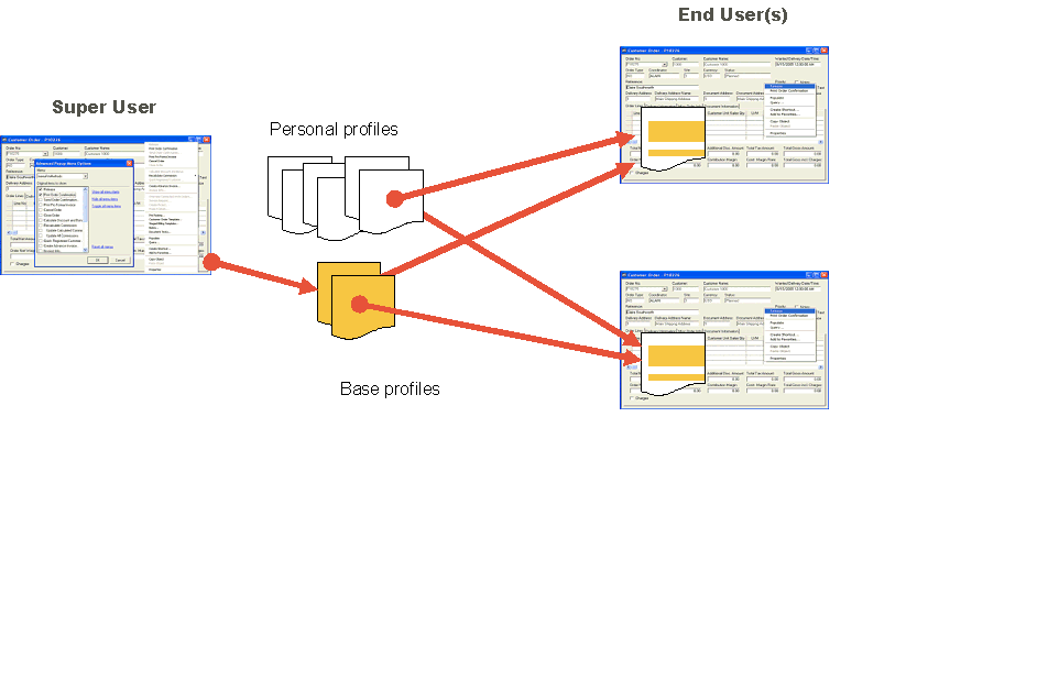The total user profile is thus a combination of the settings from the personal profile plus the settings from the base profile which are not in the personal profile. Each user always has their own personal profile but they may share the same base profile with other users. The base profile is controlled by an administrator. Changes to the base profile are effective to the users assigned to this base profile the next time they start the client.