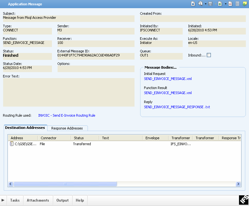An application message can contain initial request, function result and reply bodies. Inbound messages do not contain function result. Initial request body consists of XML data to be used in processing the message. Function result consist the result of the initial request after processed by the BizAPI. A reply body consists the data sent in a reply message. This may be XML, PDF, Text or Binary data. The body is always stored in original format.