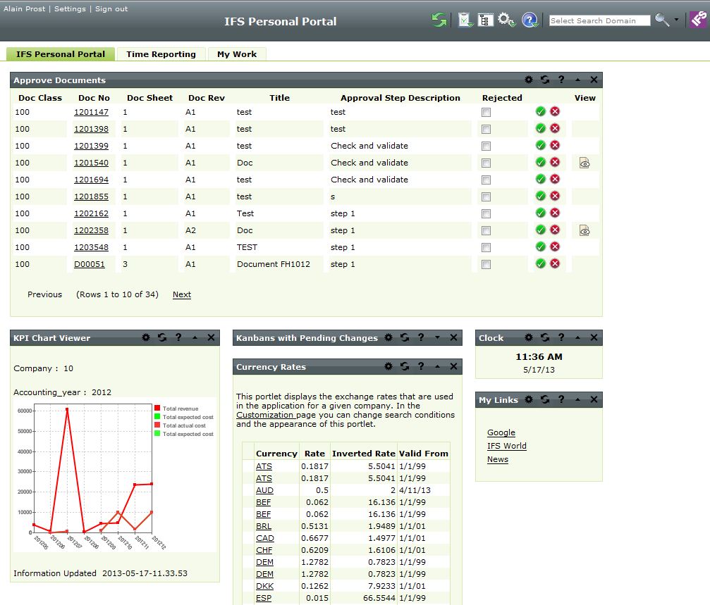 The IFS Personal Portal is the portal interface to IFS Applications. The idea behind the IFS Personal Portal is to be an easy-to-grasp information trigger. The Portal is provided to act as an entry point to IFS Applications. All important information is collected in the same place, not in full detail but enough so that any important changes are quickly highlighted. It is then very easy to drill down and keep exploring the information. As an entry point, the Portal offers the ability to start other Web pages, as well as the IFS Windows Client application.