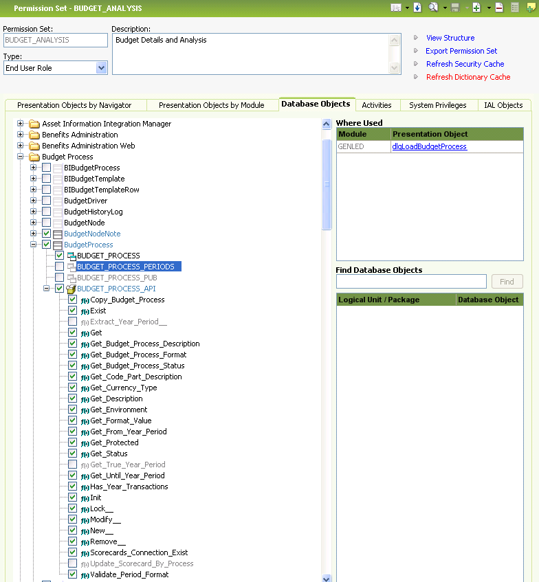The Database Objects used by a Presentation Object are listed in the tree when expanding the Database Objects node. This node is only present if the Presentation Object uses any Database Objects. Set the checkboxes for the Database Objects you want to grant and unset the checkboxes for the Database Objects you want to revoke. To see which Presentation Objects that are using a Database Object just select the Database Object and these Presentation Objects will be shown in the Where Used list to the right. This is helpful when you work directly on the Database Objects to manage security. Note that when revoking a Presentation Object only the Database Objects which are not used by other granted Presentation Objects will be revoked. Read more about this in the Interaction between Presentation Objects and Database Objects. Methods not possible to revoke are pragma methods. The security for a pragma method is the same as its database package security. Thus you must revoke the database package in order to revoke the pragma method. This can be done in the Database Objects View.