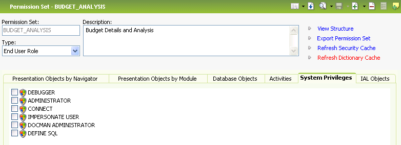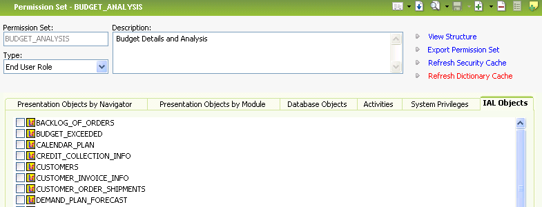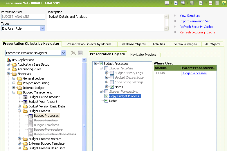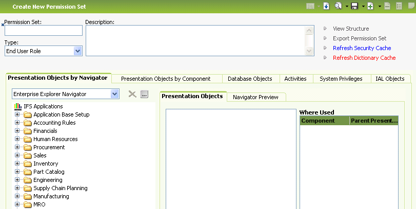 The Permission Set Detail window shows different kind of security objects like Presentation Objects, Activities, Database Objects etc. If these objects are changed you may need to refresh this data. Normally these objects are not changed unless you upgrade the system. In such case the upgrade procedure will also update the Dictionary where this information is stored. However if changes are done to the logical units in the database that affect the dictionary the "Refresh Dictionary Cache" is shown in red. Run this option to refresh the security objects used when granting and revoking access to permission sets. The Permission Set Detail window also remembers (within the same session) the definition of Presentations Object like which Database Objects that is uses and what other Presentation Object it uses. This means that if a Presentation Object has been modified in the Presentation Object Detail window you may need to update the Permission Set detail window. Right-click in the window and select "Refresh Security Objects". This will refresh all the security objects loaded to the form. These objects will otherwise be refreshed after restart of Enterprise Explorer. You can also on each tab page refresh only those security objects on that tab, like "Refresh Database Objects" available on the Database Objects tab page. When "Refresh Dictionary Cache" is executed from this window the refresh of all security objects is also performed.
