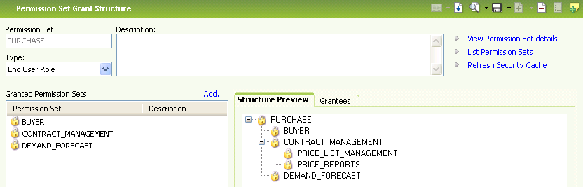 A Permission Set which has the Permission Set Type "Functional Role" can grant the permissions to other Permission Sets. These Permission Set grants are managed from the Permission Set Grant Structure form. You can navigate to this form from the Permission Set form by clicking on the View Structure link or from the Permission Sets form by right-click on a Permission Set and select View Permission Set Structure.