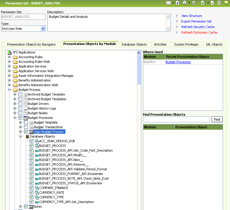 To see which Presentation Object that uses this Presentation Object just select the Presentation Object and those are shown in the Where Used list to the right. For granted Presentation Objects the checkbox is checked and unchecked if revoked. Fully granted Presentation Objects are displayed in black color and partially granted Presentation Objects are displayed in blue color. Fully granted means that all Database Objects that this Presentation Objects uses are granted and partially granted means that some Database Objects that this Presentation Objects uses are revoked.