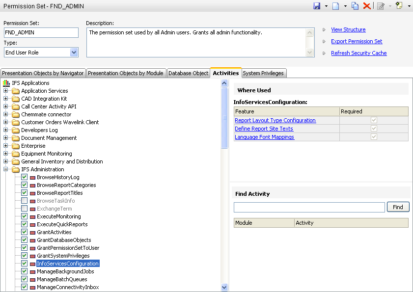 Permission Sets is the base for administrating authorities in IFS Applications. A Permission Set is a set of permissions which you can grant to users to give them the authority to perform tasks like view or update certain information. There are different types of permissions like access to Database Objects, Activities, Services or System Privileges.