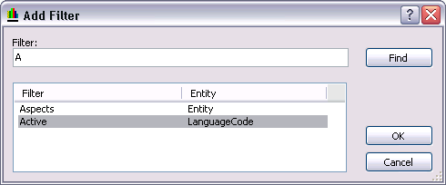 To add a filter right click on the granted activity and select the Add Filter... menu option. This opens up the Add Filter dialog. You can search for existing filters, you will see both the filter name and which entity it applies for. Search for % to find all filters. To select a filter double click on the filter or use the OK button.