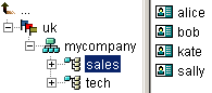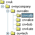 As an example, we could have Sally belong to organizational unit Sales of company MyCompany within the United Kingdom. This may have been implemented in Novell eDirectory as: