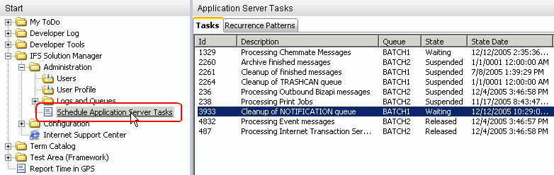 Application Server Tasks are normally scheduled tasks. Scheduling is done by adding recurrence pattern(s) to the given task. The feature Schedule Application Server Tasks in IFS Solution Manager is used to administrate the Application Server Tasks and Recurrence Patterns that are added to it.