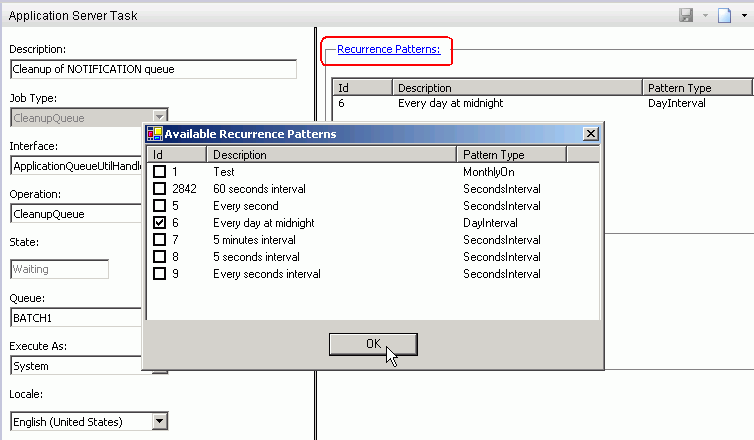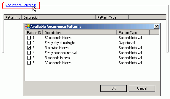 One or more recurrence patterns can be connected to a task so that it will be executed periodically. Click on the link Recurrence Patterns and check/uncheck the patterns in the popup window to add/remove the patterns to/from a task.