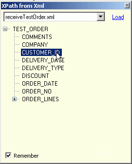 Load the required xml document and double click on a node to select its element name and the corresponding xpath string. The document will be saved in the local client profile if 'Remember' is checked. The RMB 'Clear' on XPath dialog can be used to clear the saved documents