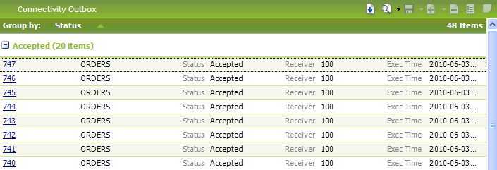 This window can be used to browse or administrate messages contained in the Connectivity Outbox. Navigate to Solution Manager / Integration / Connectivity to open the form.