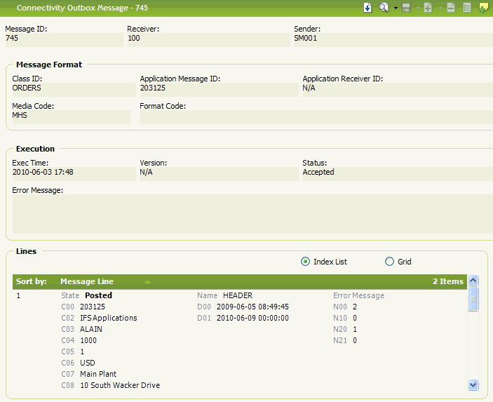 When an Outbox message is processed by the Batch Server, it will create an application message which will be used in the future processing by IFS Connect Framework. The message id of the relevant Application Message for a particular Outbox message will be displayed in the Outbox message in the Application Message Id field. If the user needs to see the detail record of that Application Message he/she can use the View Application Message in the context menu and view the Application Message which will be opened in the Message Queues feature.